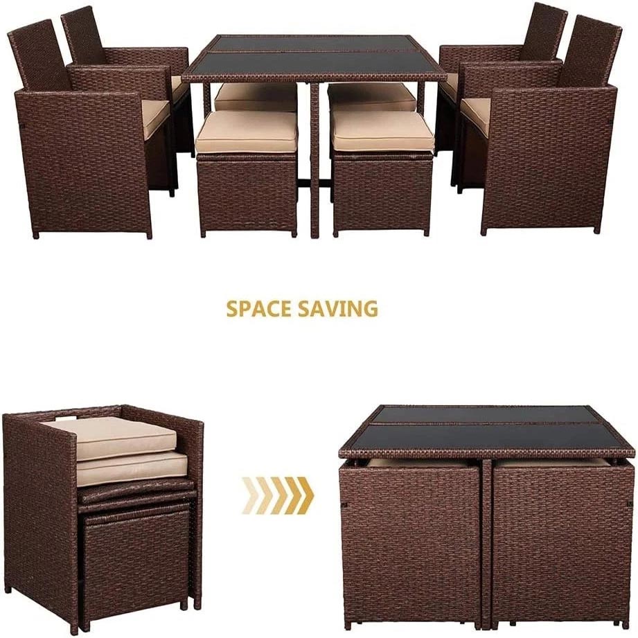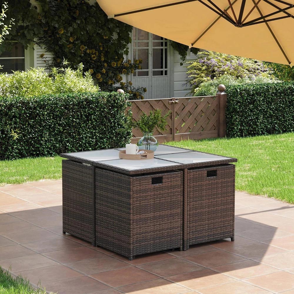 - The stools and armchair of this patio dining sets can fit under the dining table into cube for compact storage. It is ideal for the patio, porch, garden, poolside, bistro and sunroom/conservatories. Includes outdoor cover. The design of this outdoor dining set is a perfect blend of country chic and modern minimalism, adding an elegant touch to your house.