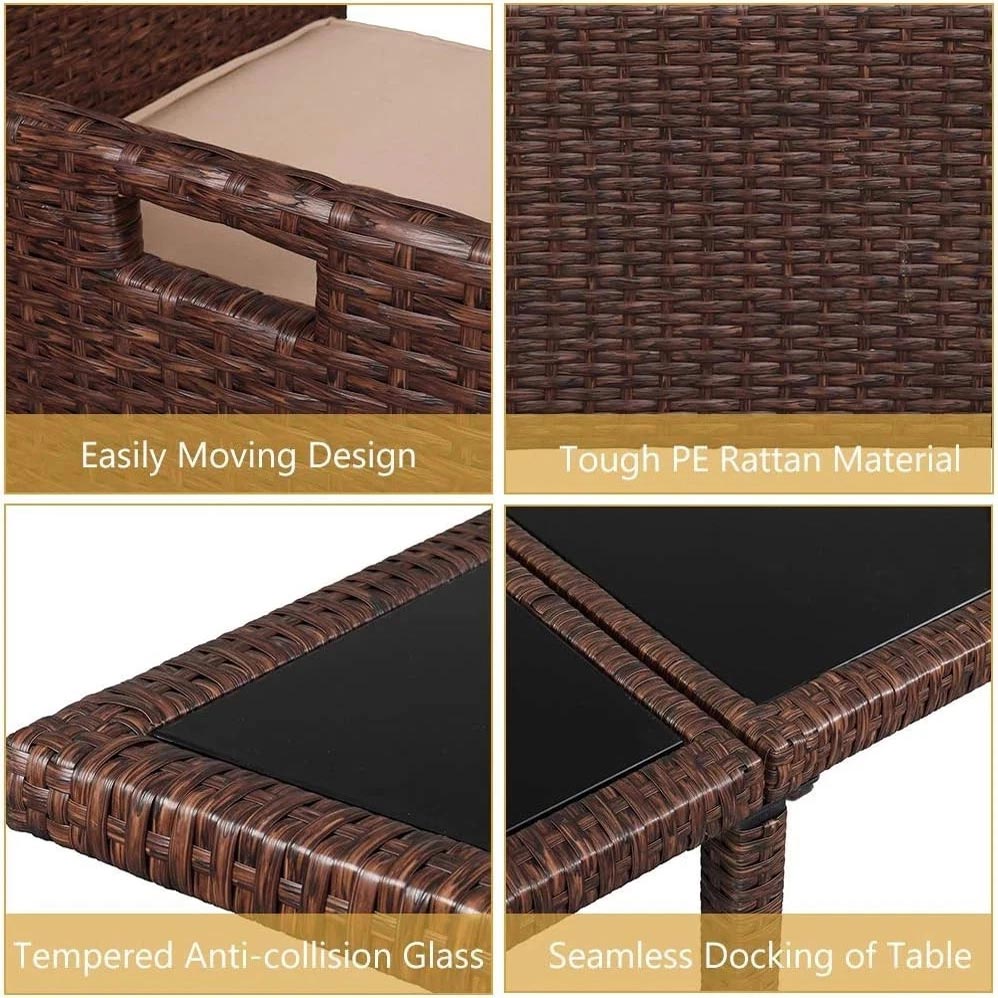 - This patio furniture set is made with a powder-coated steel frame and hand woven weather-resistant PE wicker which provides durability, which has strong toughness and excellent load-bearing performance. It is not easy to break after long-term use. It is weather-resistant, UV-light-resistant, dirt-repellent. The glass on the coffee table is 5mm tempered glass.