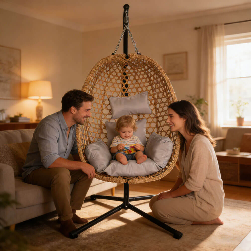 1. Strong & Secure Suspension Design — Built with a dual-chain suspension system, this hanging chair offers stable, controlled movement and supports up to 150 kg, ensuring a safe and relaxing experience.