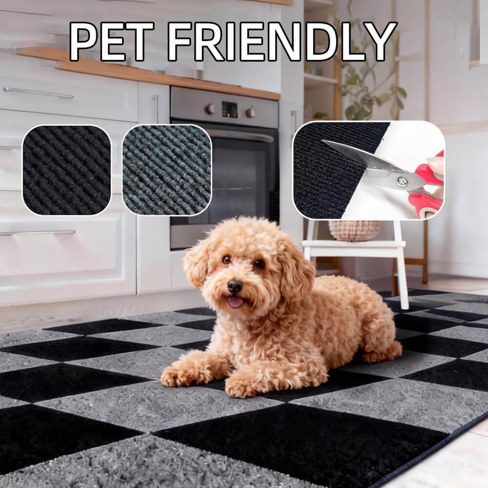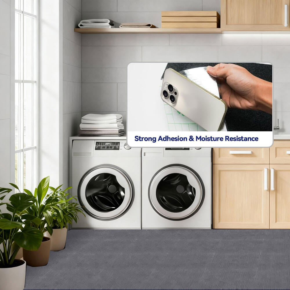 2. Strong Self-Adhesive Backing — Designed with a PET self-adhesive backing, each tile offers reliable grip and anti-slip performance. It adheres securely to any clean, smooth, and dust-free surface — including concrete floors.