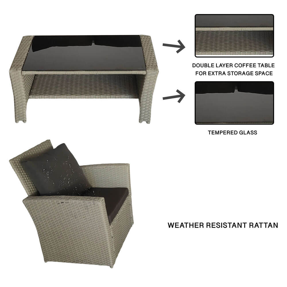 - Solid powder-coated steel frame and hand woven weather-resistant PE wicker which provides durability. Double layer coffee table providing extra storage space. The glass on the coffee table is 5mm tempered glass which is very tough.