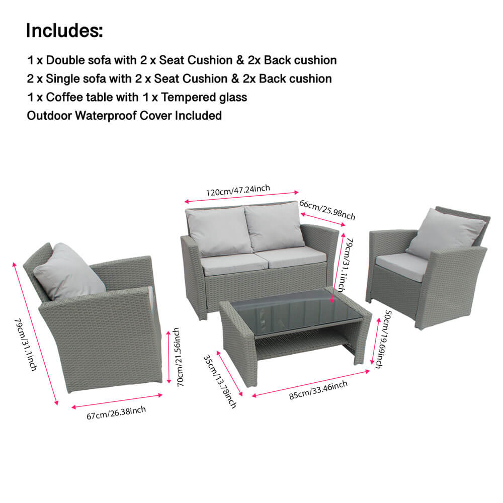 - Great 4 seater outdoor sofa perfectly fits your body curve which makes long time sitting enjoyably. Armrests also give you the best support and make you cozy. Comes with thick lofty sponge padded cushions.