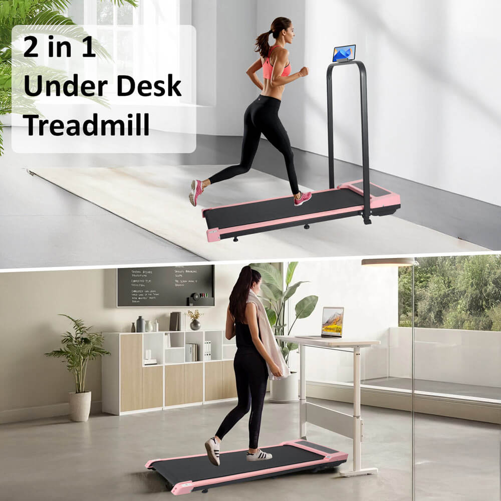 - Plug in and use our treadmills to exercise right away! Compared to traditional treadmills, our under desk treadmills eliminate the tedious assembly process and potentially high assembly costs. Under desk treadmill offers you the easiest exercise pleasure! You can easily put up the foldable handrail and phone/pad holder.